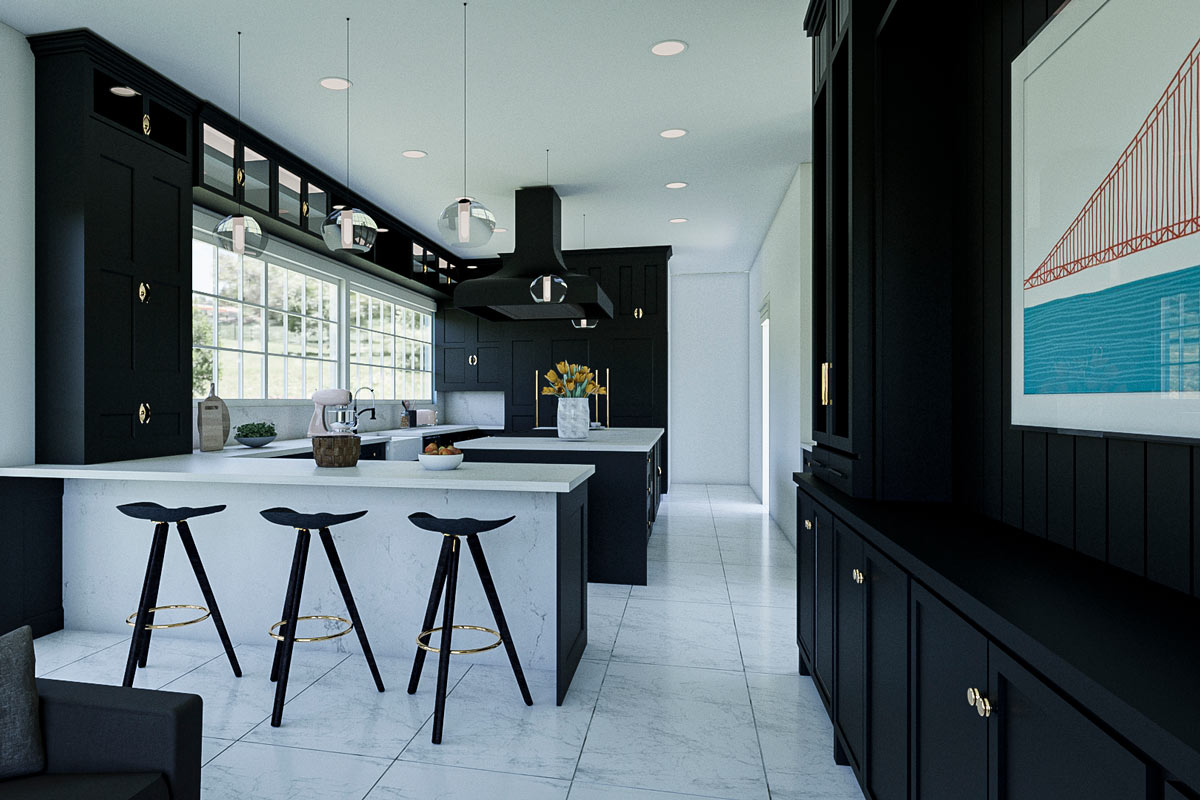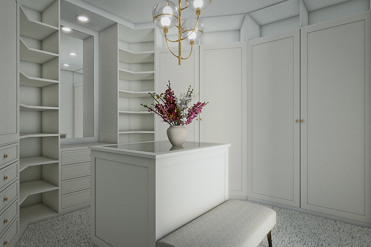 The kitchen was defined according to the Tuxedo style, where elegance predominates through the simplicity of black and white. The master closet was designed with a white mantle combined with gold details.